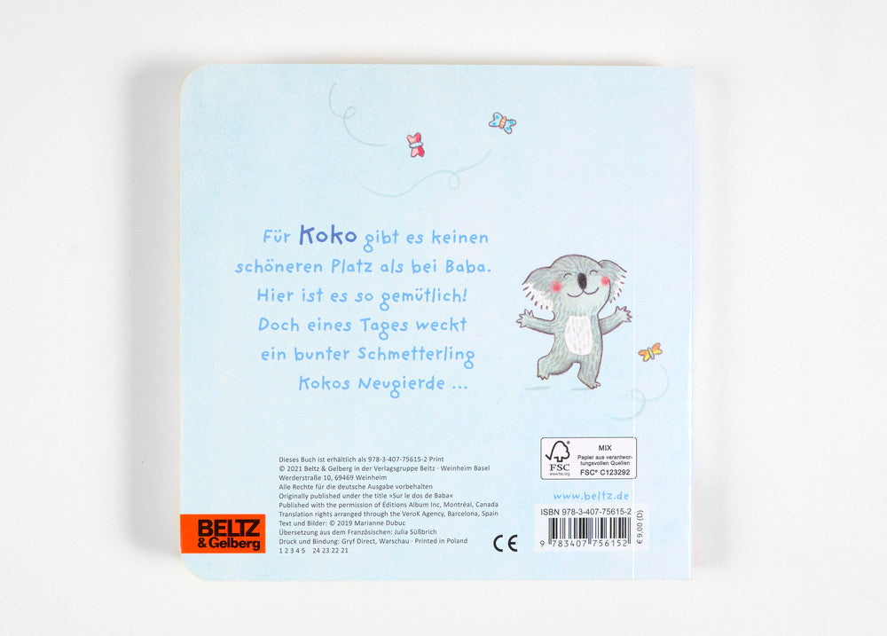 Bei Baba von Marianne Dubuc Nirgendwo ist es schöner als bei Baba. Koko kuschelt sich in Babas Fell, da ist es warm, weich und wunderbar gemütlich. Von Babas Schultern aus hat Koko einen guten Überblick und auf Babas Kopf kauernd, kann Koko baden, ohne allzu nass zu werden. Doch eines Tages weckt ein bunter Schmetterling Kokos Neugierde. Ob Koko wohl doch einmal von Babas Rücken hinunterklettert und die ersten eigenen Schritte wagt?