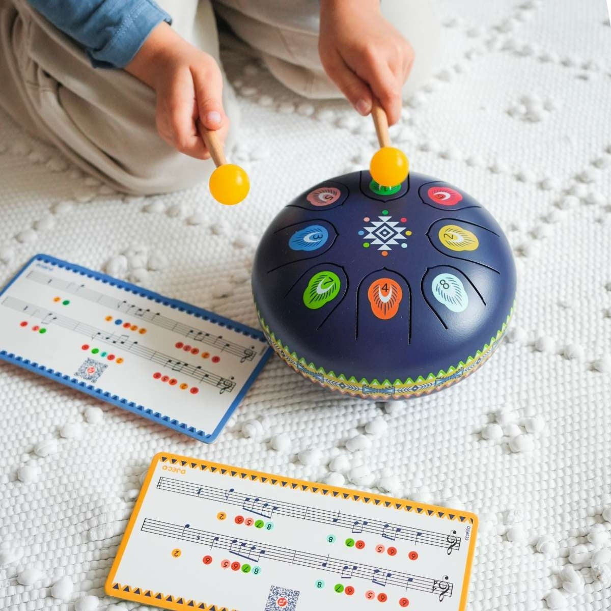 Eine wunderschöne Trommel aus Stahl. Ein Schlaginstrument mit 8 Laschen, die 8 Musiknoten entsprechen. Es lässt sich intuitiv und ganz einfach spielen: Das Kind muss nur mit den Stäbchen auf die Laschen schlagen und schon gibt das Instrument über Vibrationen einen sanften, entspannenden Klang ab. Perfekt für die Kreation oder zum Nachahmen von beruhigenden Melodien! Das ideale Geschenk für kleine Musiker ab 5 Jahren.