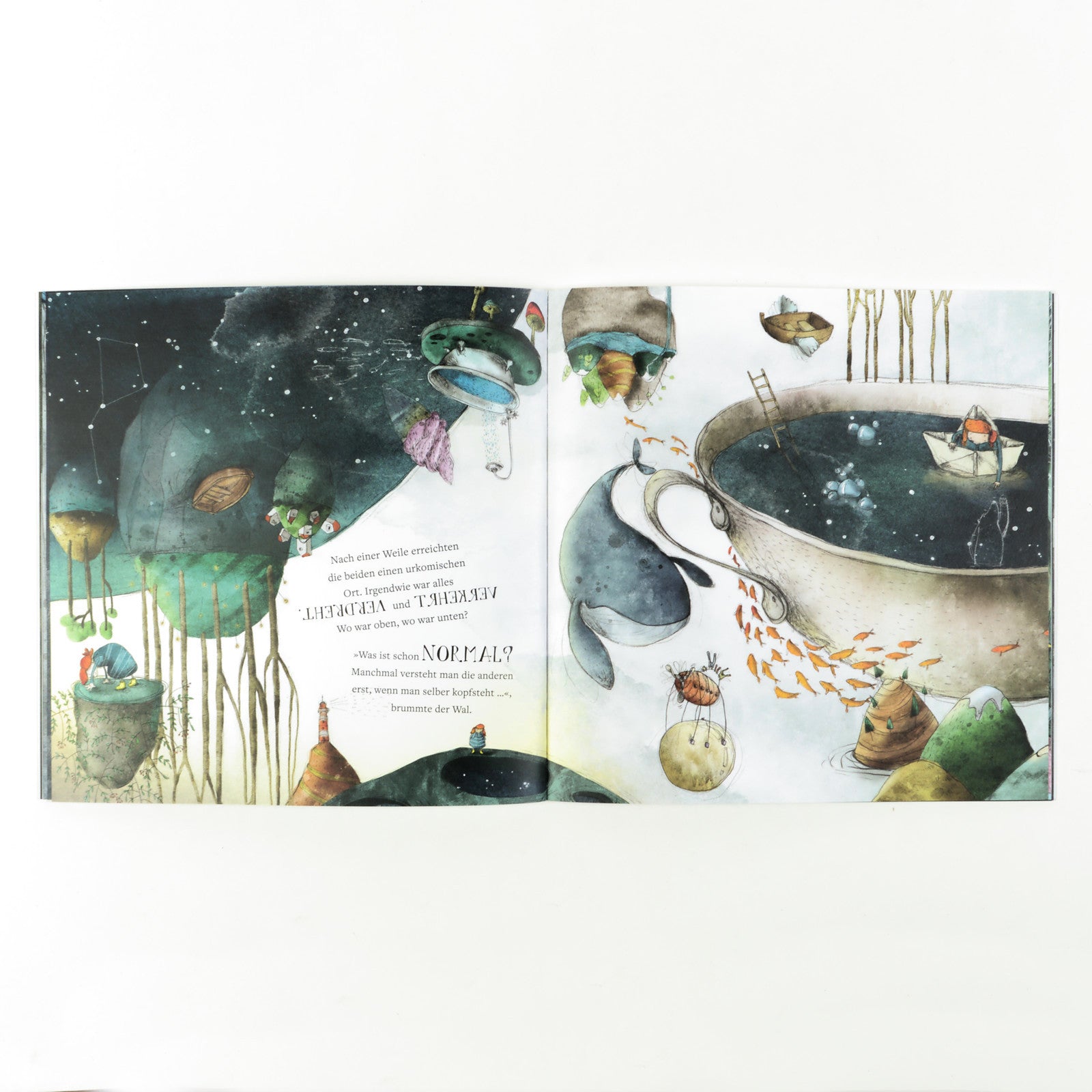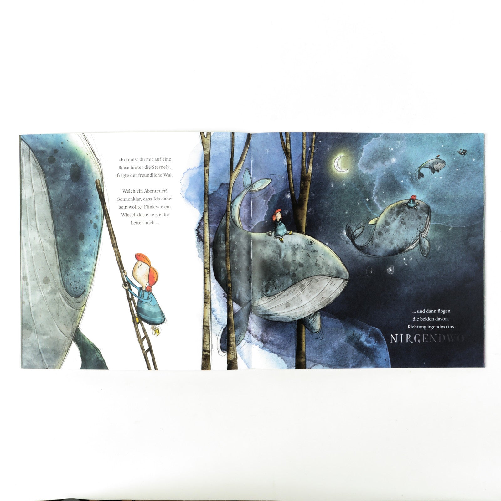 Eines Nachts taucht an Idas Fenster ein fliegender Wal auf, der sie mit auf eine Reise durch Raum und Zeit nimmt. Gemeinsam erkunden sie das Land, in dem alles verkehrt herum ist, und segeln ins große Nichts. Der kluge Wal navigiert, berät und steht Ida bei allen ihren großen Fragen zur Seite – auch dann noch, als er schon wieder verschwunden ist. Ein fantastisches Bilderbuch, das zum Träumen und Philosophieren einlädt.