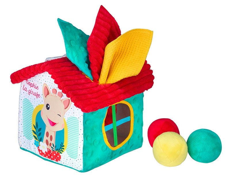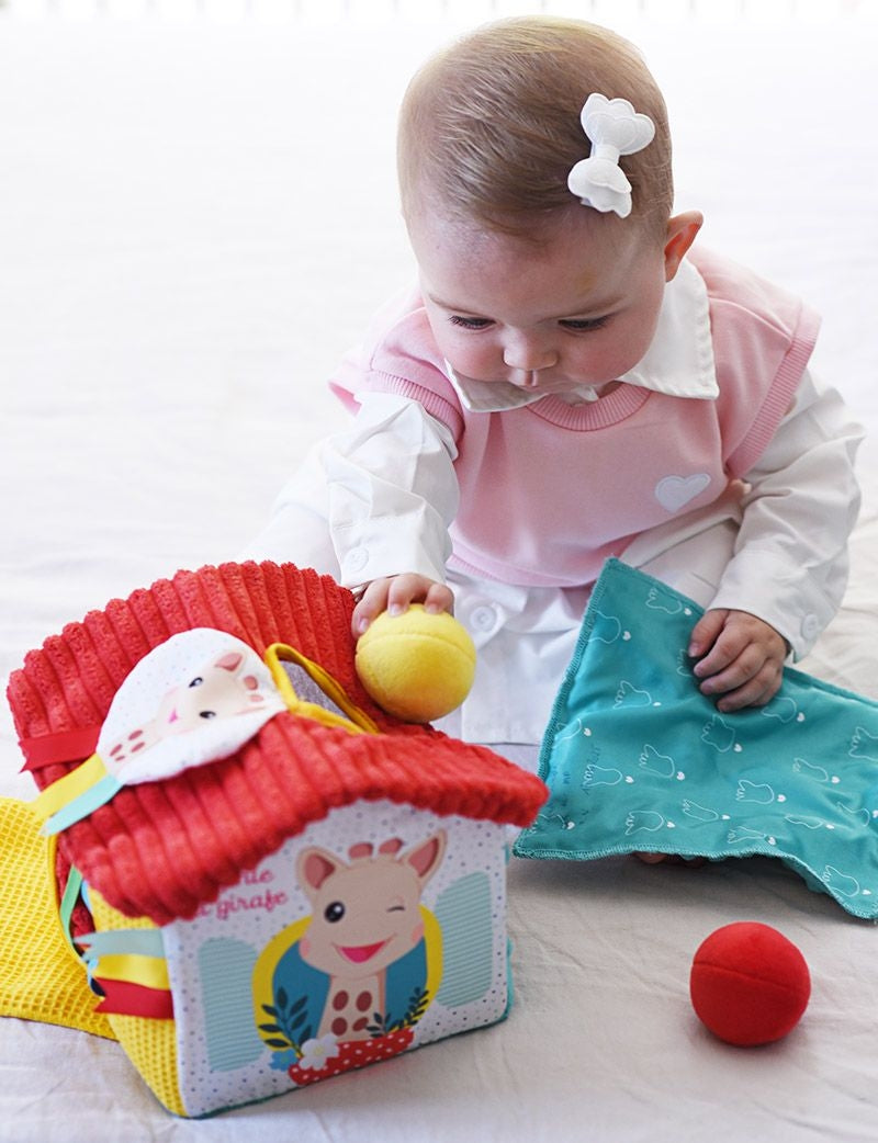 Das Baby steckt seine Hand durch die Öffnungen im Dach oder die beiden Fenster und wird dabei folgendes entdecken: - 3 bunte Bälle, von denen einer ein Glöckchen enthält, um Babys Gehör anzuregen - 3 Stofftücher, eines davon mit Raschelpapier und verschiedenen Strukturen, um seinen Tastsinn zu entwickeln Ihr Baby kann sich damit vergnügen, Gegenstände herauszunehmen und hineinzulegen, indem es seine kleinen Finger durch die Gummibänder der beiden Fenster und die Öffnungen des Daches steckt. Auf diese Weise entwickelt es spielerisch seine Handbeweglichkeit und Feinmotorik.
