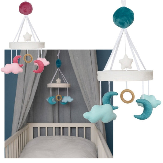 Zaubern Sie ein Lächeln auf Babys Gesicht! Ein farbenfrohes Babymobile beispielsweise über dem Wickeltisch sorgt für strahlende Augen und genügend Ablenkung beim Wickeln. Die bunten Figürchen tanzen zauberhaft umher während man in Ruhe wickeln kann. Es hilft vielen Kindern auch beim Hilfe beim Einschlafen, weil das Beobachten der umherhüpfenden bunten Teile nach gewisser Zeit auch schläfrig macht. Bei einigen Modellen können Sie zusätzlich eine kleine Spieluhr aufziehen um noch mehr Aufmerksamkeit auf das Schauspiel zu lenken. Es gibt aber auch zusätzlich zwischenhängbare Uhrwerke, die Melodien abspielen. Diese kann man jederzeit bei allen Modellen nachrüsten. Man hängt sie einfach zwischen Deckenhaken und Mobileöse.