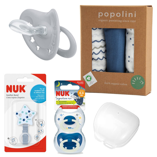 Baby Geschenkset 7-tlg Sterne Blau (Schnuller, Band, Box, Schnuffeltuchset)